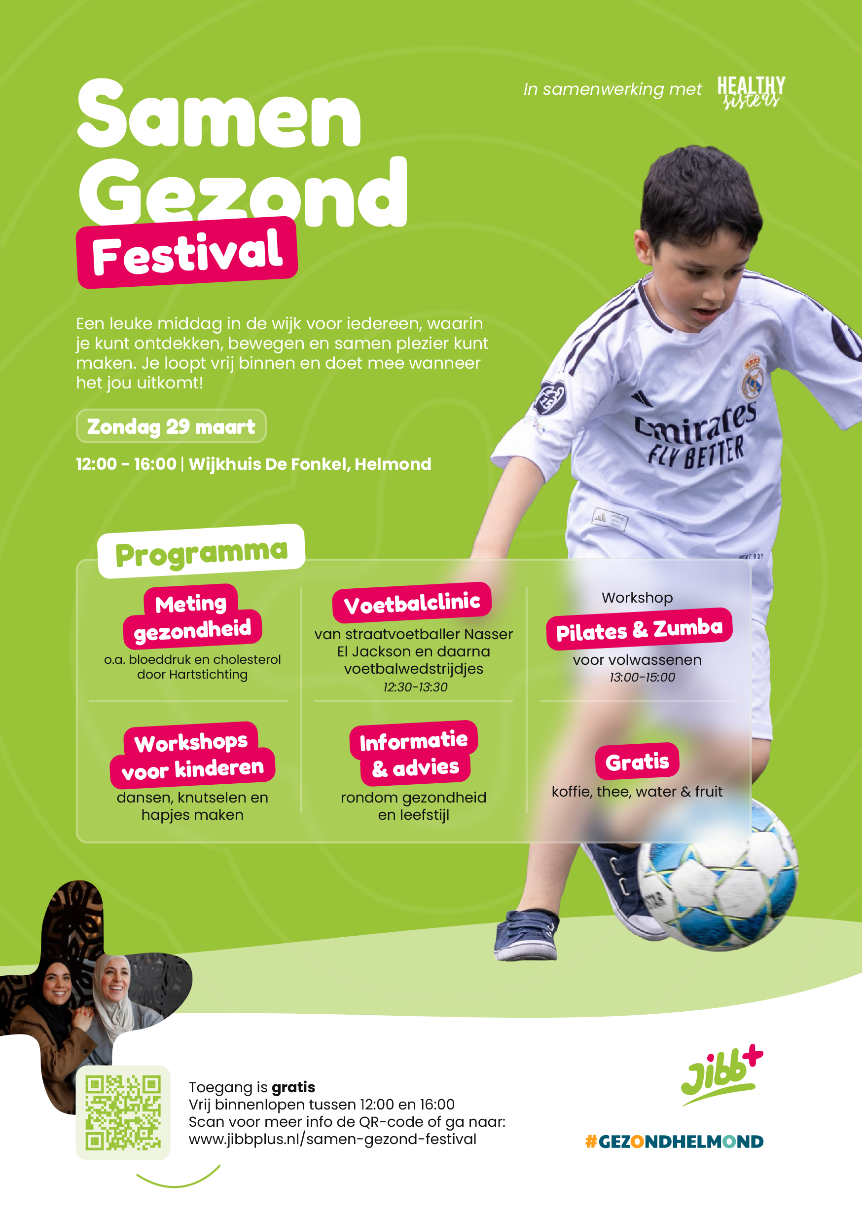Een gratis festival met workshops, sportactiviteiten en gezonde initiatieven voor jong en oud Op zondag 29 maart organiseren Jibb+ en Healthy Sisters het Samen Gezond Festival in Wijkhuis De Fonkel in Helmond. Het festival staat in het teken van ontdekken, bewegen en samen plezier maken en is gratis toegankelijk voor alle inwoners. Healthy Sisters bestaat uit de Helmondse zussen Rachida en Najima Kharbouch. Vanuit hun eigen ervaring met een gezonde leefstijl inspireren zij via hun platform en activiteiten een brede doelgroep om gezonder en bewuster te leven.
