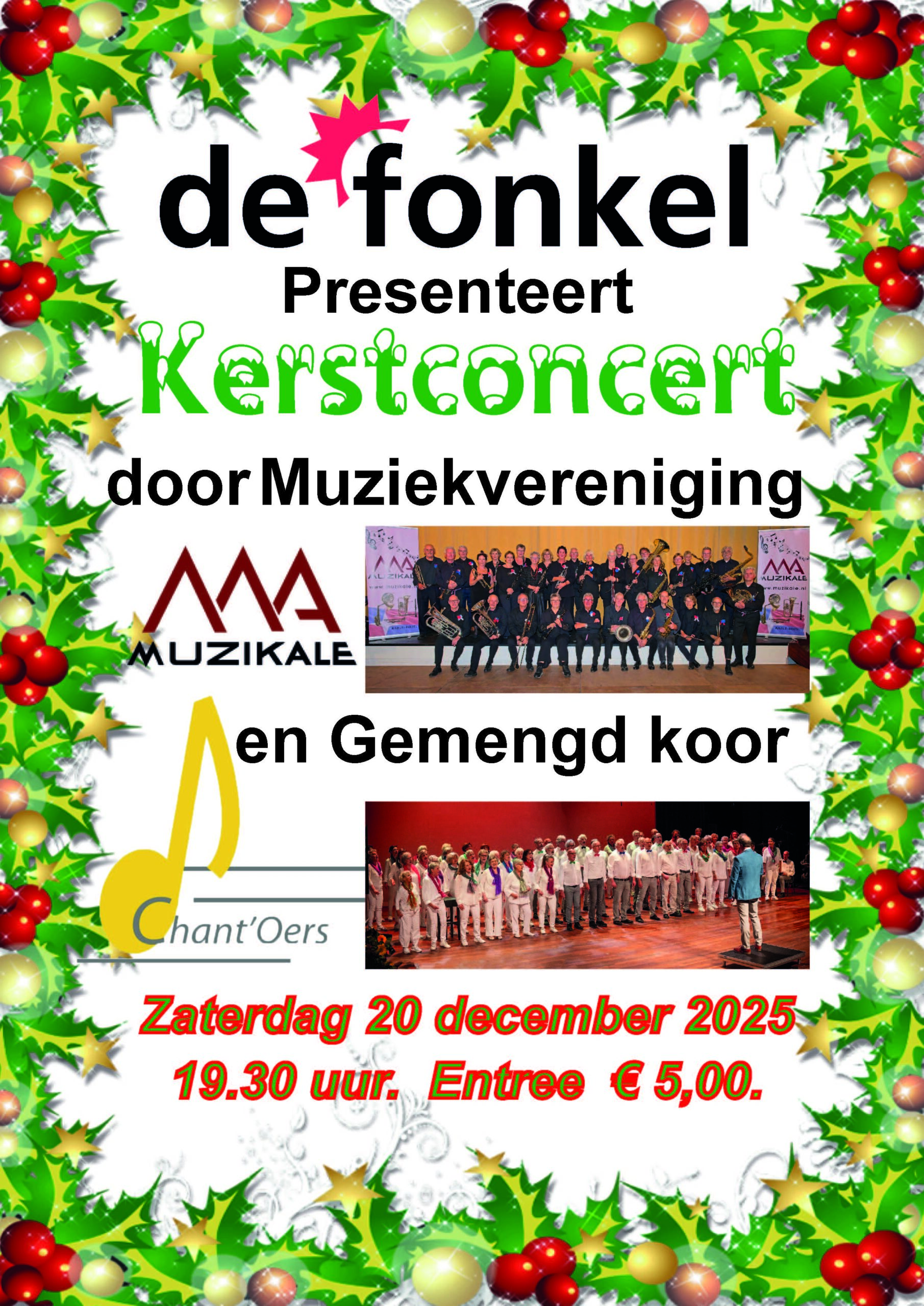 Zaterdag 20 december 2025 zal muziekvereniging de Muzikale en het Gemengd koor Chant’Oers zowel afzonderlijk alsook samen een gezellig en sfeervol Kerstconcert geven in de Fonkel. Ook het publiek wordt van harte uitgenodigd mee te zingen.