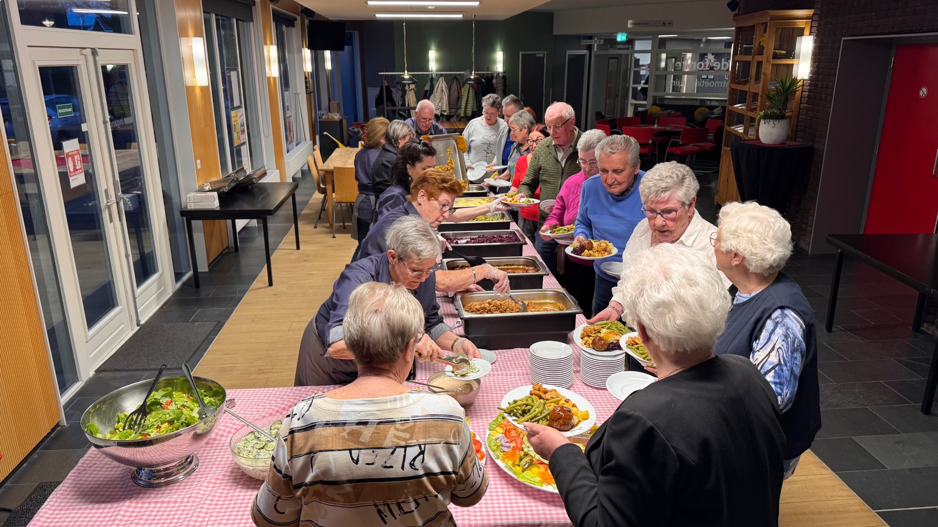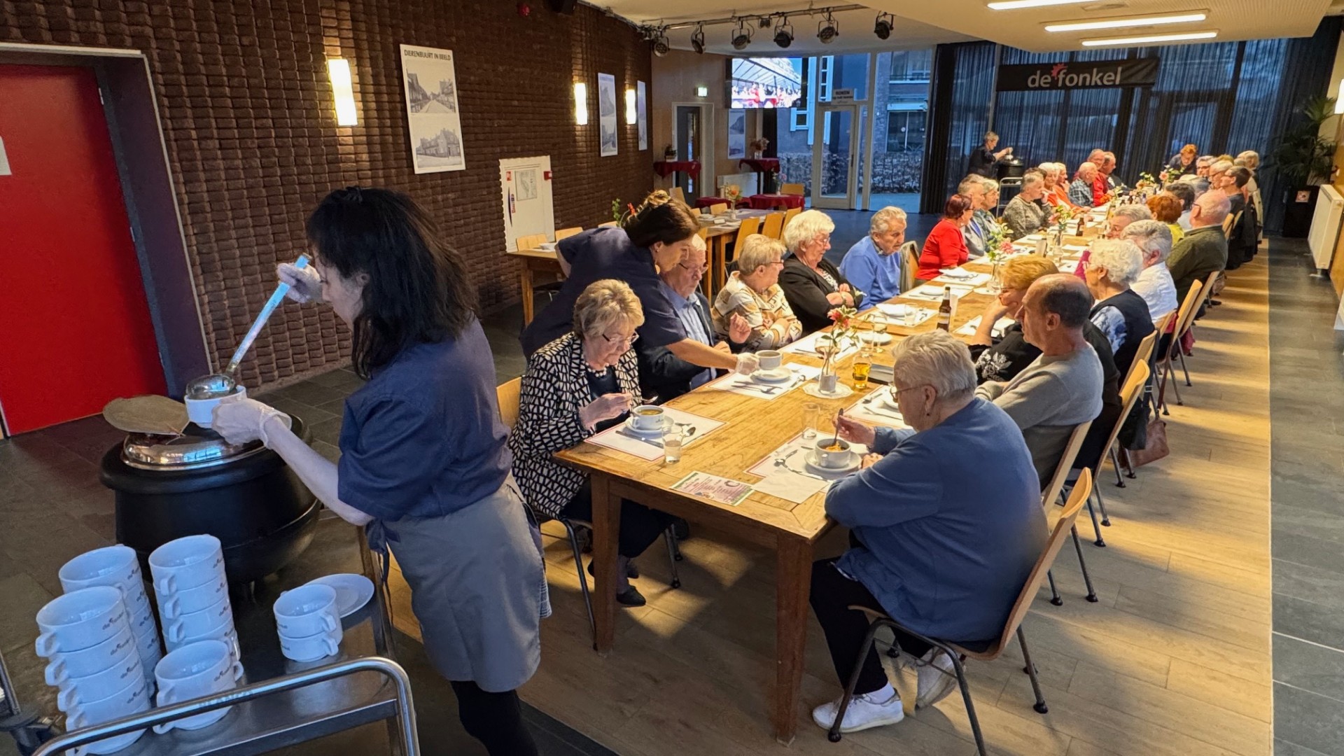 Aan 1 lange tafel werd er een 3 gangen menu geserveerd. Het was voor iedereen die zich vrijwillig had gemeld om de avond mogelijk te maken, een genot om te merken dat het menu in goede aarde viel.